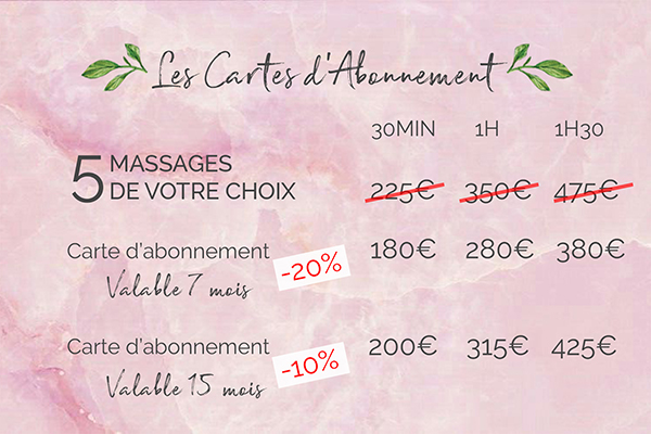 – Une carte trimestrielle de 5 massage de votre choix qui vous donne une remise de 10%.